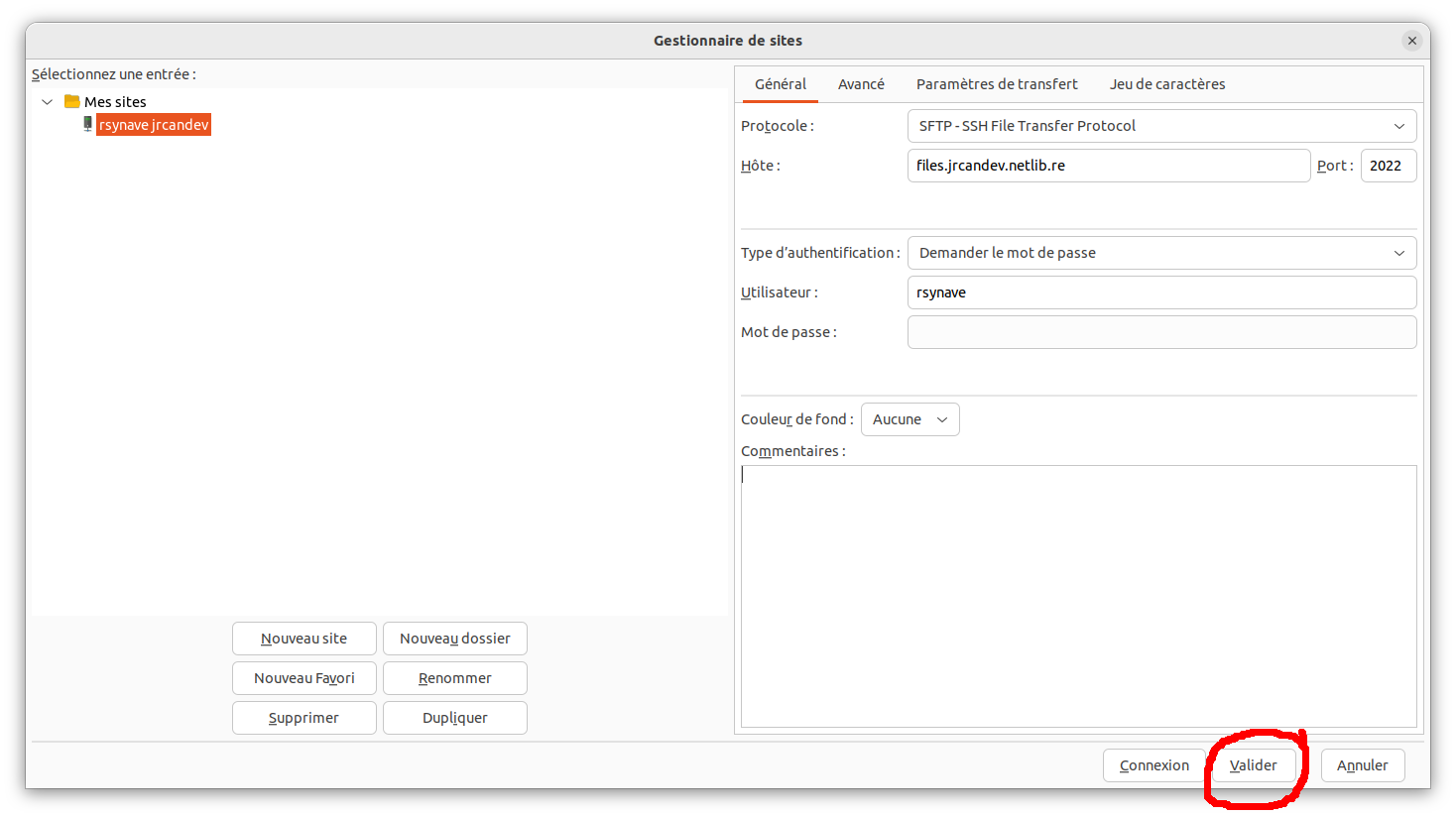 5. Revenez sur le gestionnaire de sites, sélectionnez le nouveau site, puis cliquez sur "Connexion".
